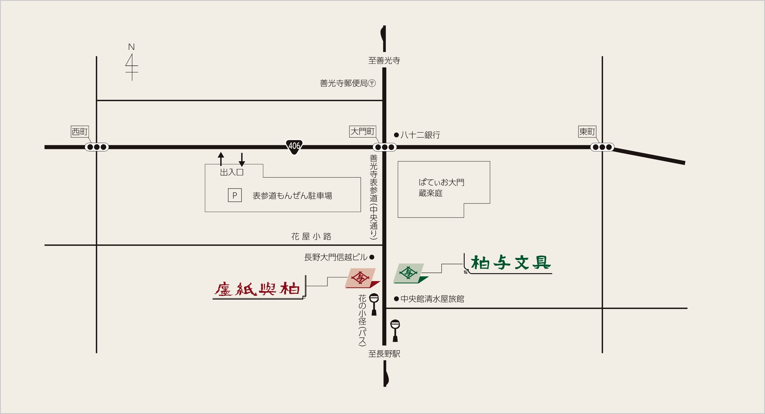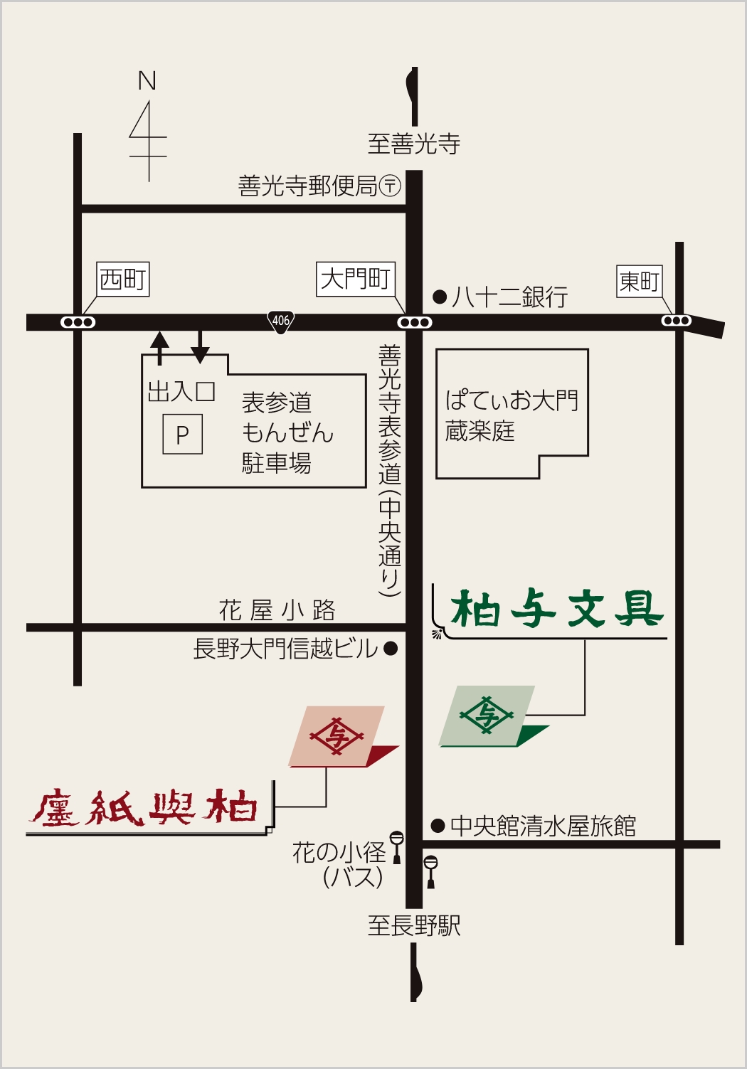 長野駅からまっすぐ、善光寺へと続く表参道商店街を歩くと、門前町の風情が漂う大門町があらわれます。この通りを進むと、道を挟んで西側に「柏与紙店」、東側に「柏与文具」があります。